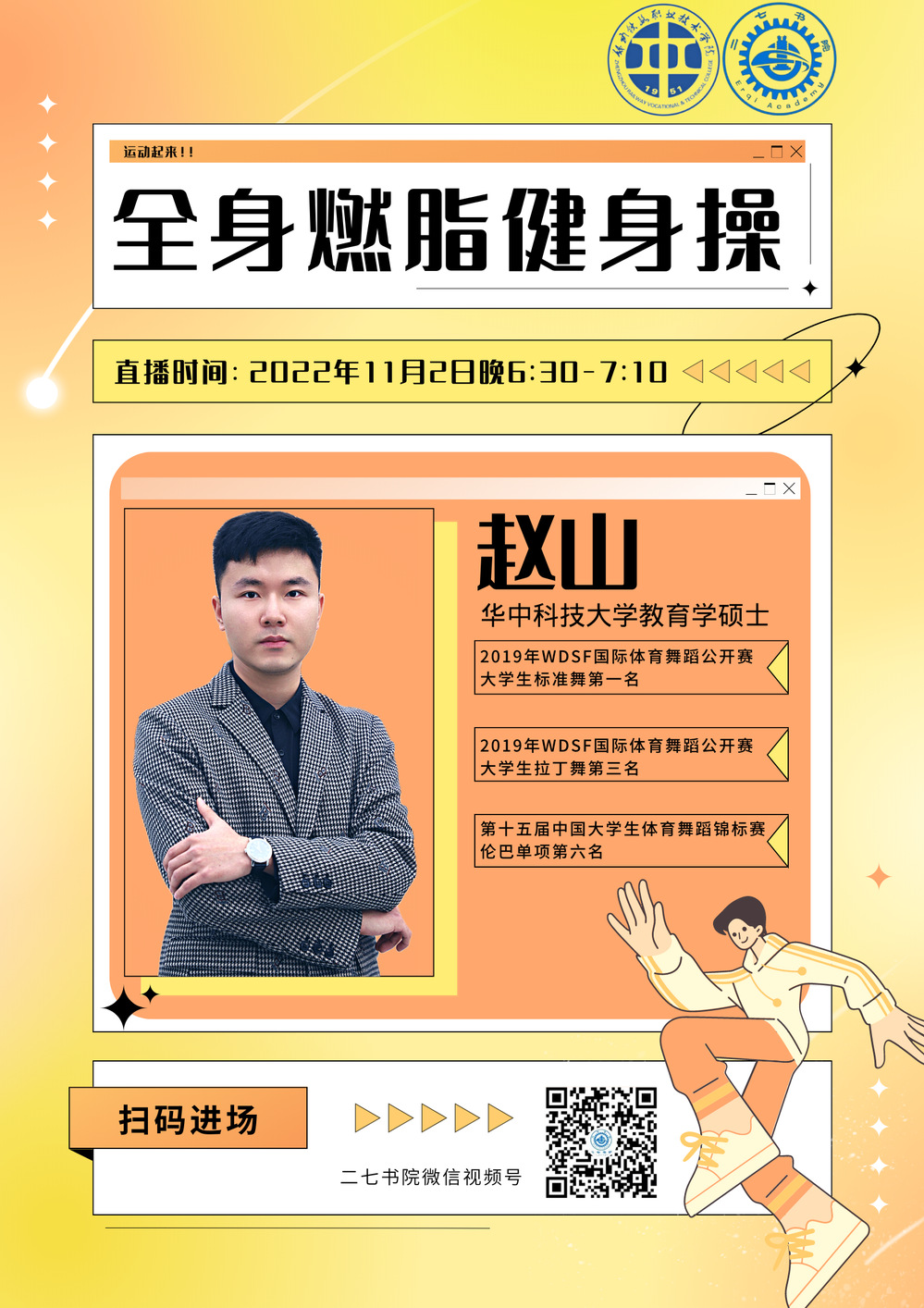 为活跃和丰富我院学生的课余文化生活,促进校园文化建设郑州铁院二七书院将于11月2日晚六点半在微信公众号以线上直播形式开展第三期通识课堂“跟着山山老师来跳操”活动,届时同学们可以扫描二维码进入郑州铁院二七书院官方微信公众号观看直播。