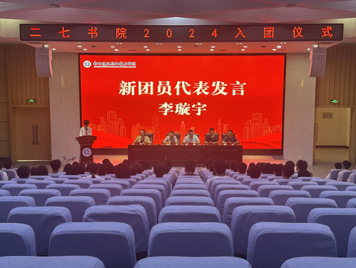 团结奋进新征程,同心奋斗创伟业。5月20日下午5点20分,二七书院在新校区第二报告厅举行2024年新团员入团仪式,以我初心,向党告白,爱党爱国、爱团爱校。二七书院党总支书记、院长郭晓斌,党总支副书记朱纹玉,党总支副书记吕蒙,学工办主任、团总支书记吉海洋出席本次活动。优秀团员代表、全体新团员参加会议。会议由团总支副书记胡宪丽主持。