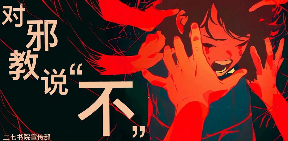为普及科学知识营造倡导文明、反对邪教的良好氛围二七书院宣传部绘制了“反对邪教 共筑平安”反邪教主题展板展板以红黑为主基调打造出学生被恐怖的手束缚的形象生动体现出邪教组织的可怕和无孔不入。展板左侧醒目书写着“对邪教说‘不’”的字样提醒大学生远离邪教,自觉加入到反对邪教、破除迷信、崇尚科学、传播文明的行列中