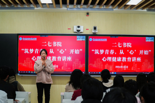 为加强大学生心理健康教育,提升大学生心理健康素养,助力同学们更好地适应大学生活,10月22日下午,二七书院邀请学校大学生心理健康教育中心心理健康导师房梦媛老师为学生开展主题为“筑梦青春,从‘心’开始 —— 大学生心理健康导航”的心理健康教育讲座。二七书院以主会场和分会场相结合的形式,2024级全体新生在9号楼503及各教室集中参加讲座,2022级和2023级全体学生通过线上直播收看讲座。讲座由二七书院党总支副书记吕蒙主持。