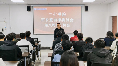 10月22日,二七书院第八周自律会暨班长例会在二七大讲堂召开。会议由学工办主任吉海洋主持,23级、24级各班级班长及自律会各部门负责人参加了此次会议。
