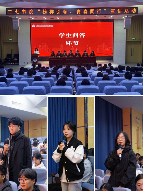 宣讲会上,2024-2025年度河南省青马工程高校班学员张怡扬分享了作为新时代青年坚定理想信念,贡献青春力量的行动实践与心得体会。全国铁路优秀志愿者王桐阳同学则介绍了自己投身志愿服务,用实际行动回馈社会的感人故事。国家奖学金获得者王彬洲、国家励志奖学金获得者娄崇潇两名同学分享了在学业上刻苦钻研、争创佳绩的心得体会;“互联网+”“挑战杯”获奖者李坤玉、董彦卓两名同学讲述了竞赛中顽强拼搏的历程和攻克难题、收获成绩的喜悦;团学优秀学生干部唐岩、李允夏就如何平衡学生工作与学习之间的关系,分享了经验体会。每一位宣讲者都用自己的亲身经历,诠释了“榜样”二字的深刻内涵,赢得在场学生阵阵掌声。在提问环节,同学们现场与身边榜样面对面交流探讨,进一步激发了他们思考自我、规划未来的热情。宣讲会后,同学们纷纷表示,作为青年学生,将以身边先进典型为榜样,向优秀学生学习,更加珍惜大学时光,付出汗水,奉献才智。