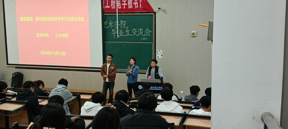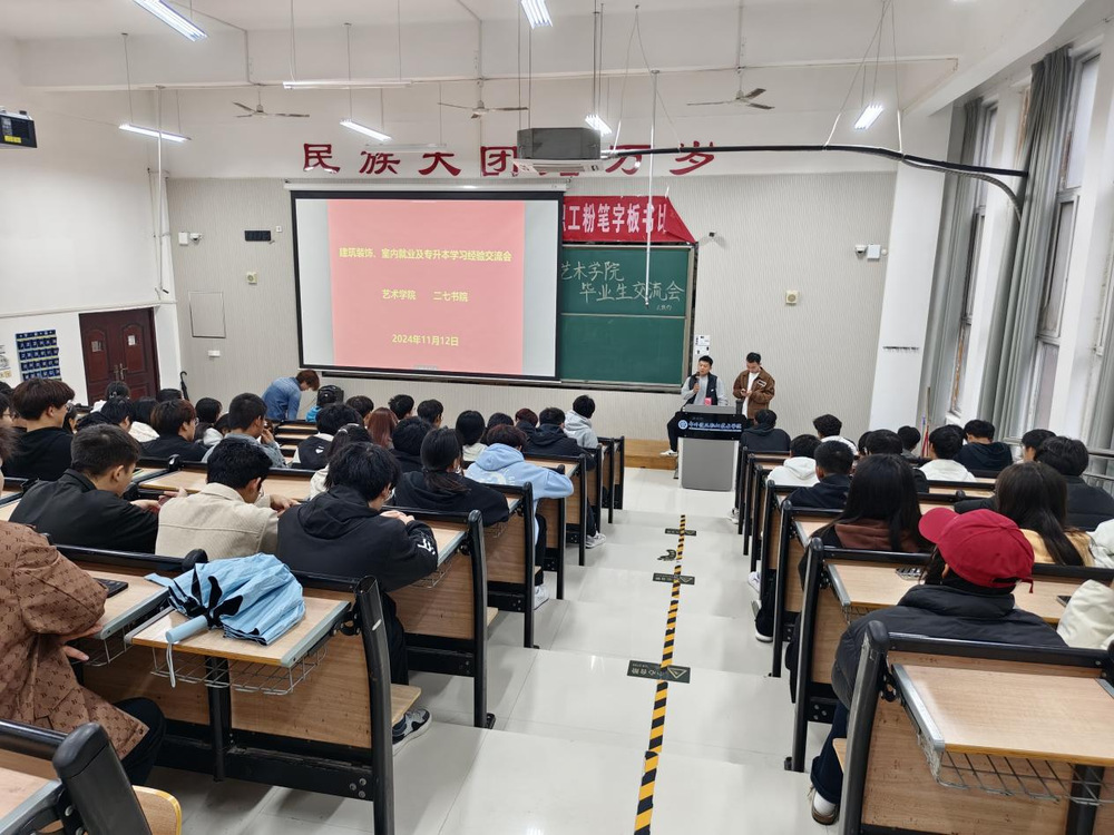 为了帮助在校学生更好地规划未来职业道路,提高学生对建筑装饰和室内设计行业现状的认识,并为有志于进一步深造的同学提供指导,11月12日下午,二七书院艺术学院在7号楼321阶梯教室,举办了建筑装饰与室内设计专业优秀校友经验分享会。beat365校友杜江飞、孙培征受邀回到母校,围绕就业和专升本进行经验分享。2023级、2024级建筑装饰工程技术专业和室内艺术设计专业全体学生参加了交流活动。