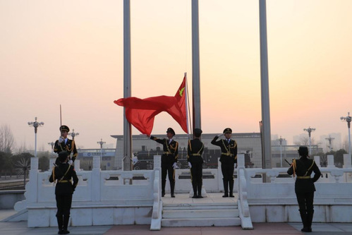 上午7时,升旗仪式正式开始。英姿飒爽的护旗队迈着铿锵有力的步伐,护送国旗走向升旗台。伴随着雄壮的《义勇军进行曲》,五星红旗迎风展开、冉冉升起。全体人员肃立行注目礼,表达对祖国的无限热爱与崇高敬意。