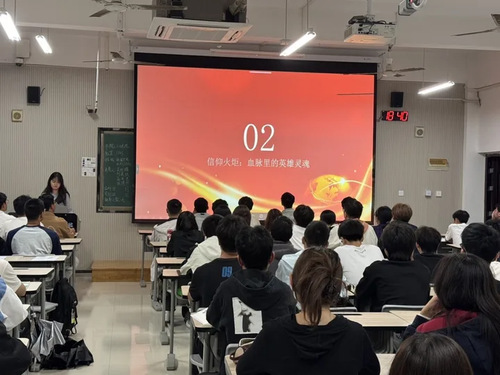 二七书院各团支部组织全体学生积极参加活动。活动以一段抗战主题短片拉开序幕,通过炮火纷飞的战场、先烈们坚毅的面容,将同学们带入那段救亡图存的峥嵘岁月,让大家在视觉冲击中缅怀先烈、致敬英雄。随后,通过PPT回顾抗战历程,从关键战役到杨靖宇等英雄事迹逐一呈现;同时深入解读新时代强军目标,引导同学们思考青年在强国强军中的使命。