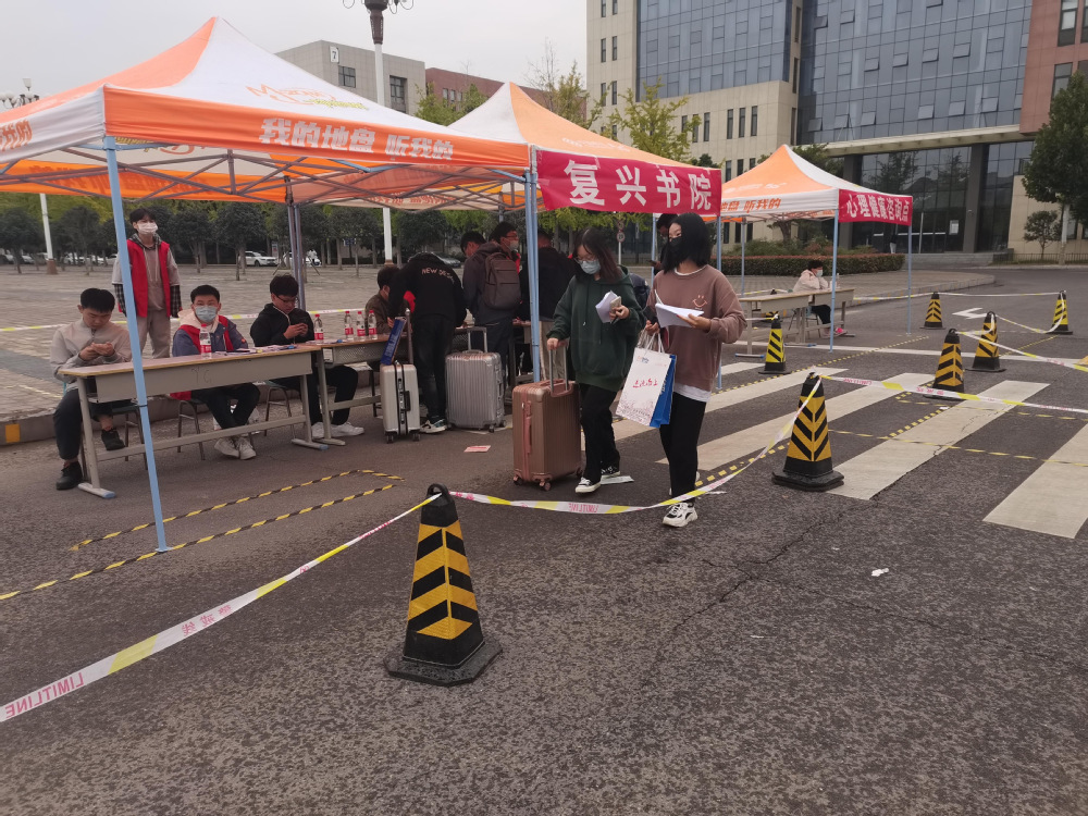 在东门口,返校的同学都有序排队,主动向工作人员出示行程码和健康码,通过测温通道进行体温监测。在复兴书院报到点,老师和志愿者们冒雨热情迎接同学们的到来,收取健康承诺书和行程表等材料,不时有志愿者帮助同学拿着行李送到宿舍。截至到下午,复兴书院学生基本返校报到。为保障学生顺利返校,复兴书院高度重视,组织100余名志愿者提前返校协助各项工作,大家各执其职,协同配合,严格按照返校流程和疫情防控要求,做好学生返校工作。