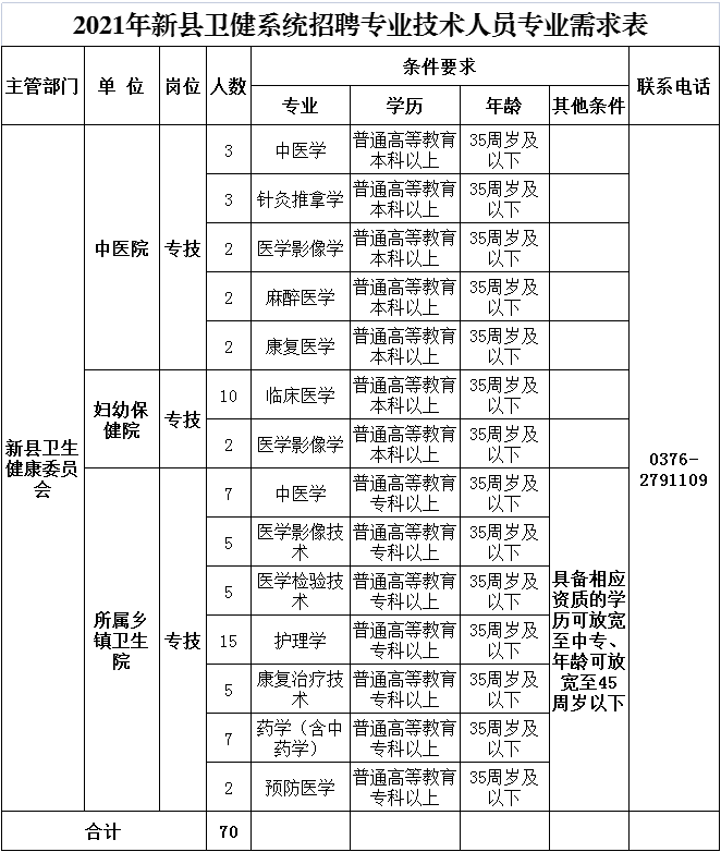 为加强我县医疗卫生人才队伍建设,提升全县医疗服务能力,结合我县卫健系统工作实际,按照“公开、平等、竞争、择优”的原则,经卫健委党组研究同意,决定为我县医疗卫生单位公开招聘专业技术人员70名,现公告如下: