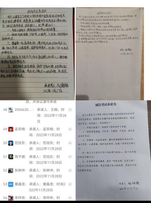 各辅导员及班主任老师分别以线上班会的形式召开了期末考试动员和诚信教育班会,引导同学们树立正确的纪律观念和诚信意识,严肃考风考纪。各班以班级群内接龙或同学们个人录制视频的方式“签订”《诚信考试承诺书》,杜绝考试作弊。与此同时,各位辅导员及班主任老师通过询问班干部、个人谈话等多种途径了解学业困难学生的备考情况,并及时给予心理疏导和帮扶,舒缓同学们因为疫情影响而造成恐惧心理。