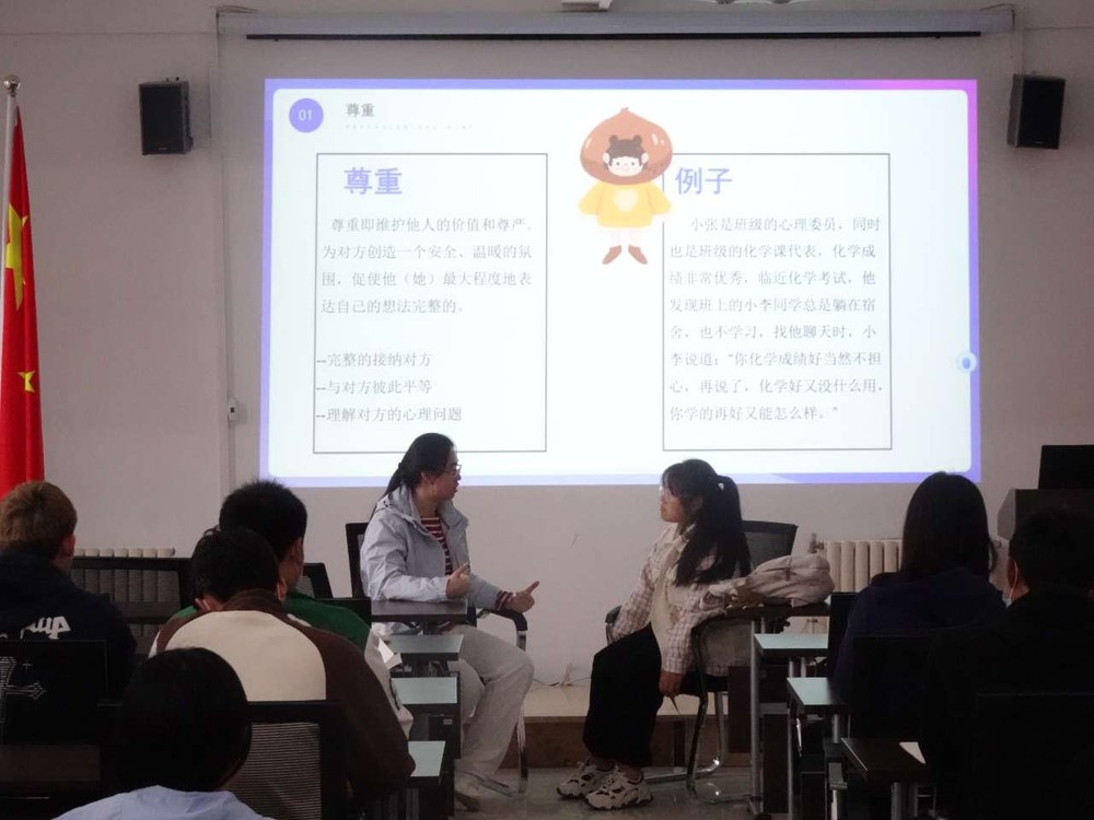 任老师由狐狸摘果子的故事为开端,为同学们普及了心理问题的六种类型,并通过生动鲜活的案例作了重点讲解。随后,任梦琪老师提出了解决心理问题必备的四个技能:真诚、倾听、共情和无条件继续主动关注,并与参会的心健委员进行参与互动,让大家更进一步了解四个技能。最后任老师讲授了辨识心理障碍的方法,鼓励同学们用真心真情去帮助同学,在帮助别人的过程中成就自己。