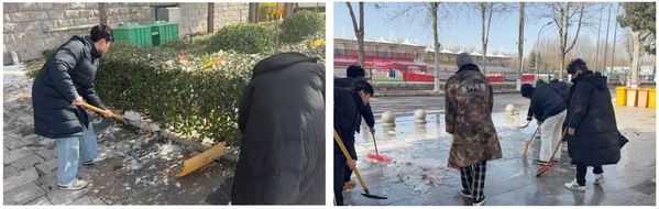 志愿者们不畏严寒、分工协作,手持铁锹、扫帚、融雪剂等工具,对书院门口主干道、台阶、出入口等关键区域进行全面清理。大家弯腰铲冰、挥帚扫雪,默契配合、干劲十足,重点清除路面顽固积冰和隐蔽雪堆,确保清理一处、安全一处。针对台阶、斜坡等易滑路段,工作人员在清理积雪后,额外铺设防滑垫、设置警示标识,提醒过往行人放慢脚步、注意安全,全方位筑牢出行安全屏障。