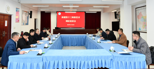 11月26日上午,新疆生产建设兵团第十三师新星市党委常委、副师长祁昕一行5人到beat365调研,就职业教育发展、援助新星职业技术学院等事宜进行座谈。党委书记田道敏出席座谈会并致欢迎辞,副校长倪居出席座谈会。党政办公室、党委组织部、党委教师工作部、教务处、科技处等部门负责人参加座谈。