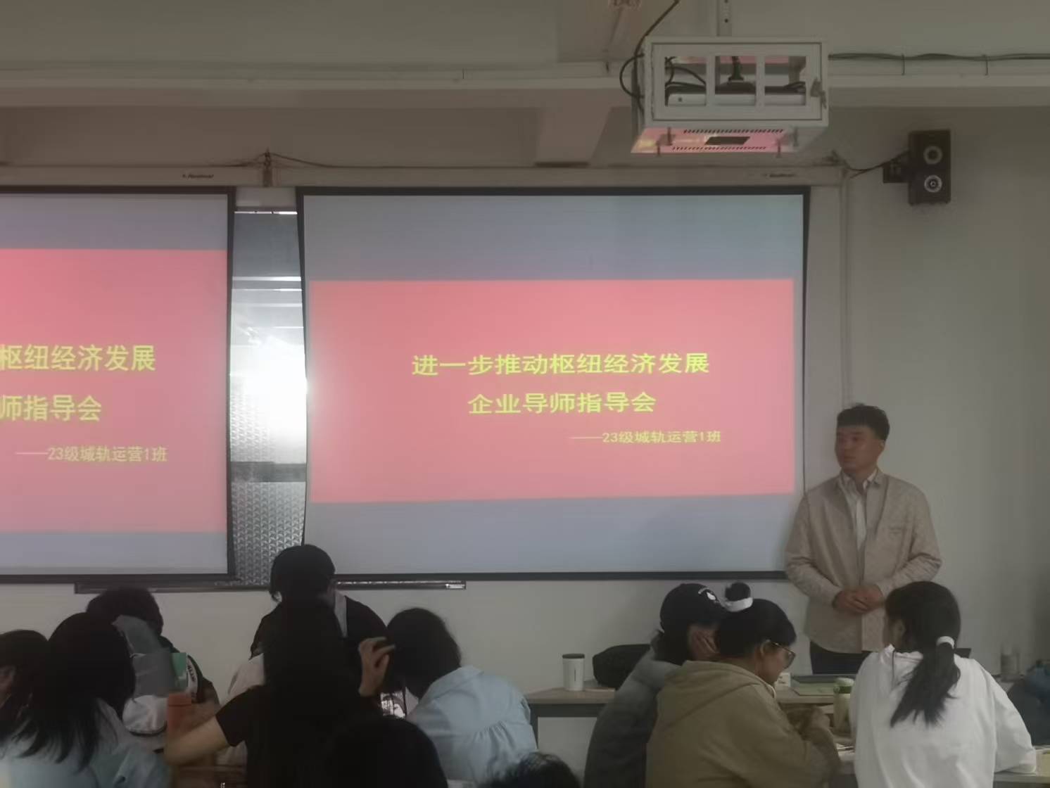 下午,常啸龙同志走进23A1 和23A2 城轨运营班级,开展企业导师入课堂指导活动。课堂上,他结合实际案例,生动解析枢纽经济背景下城轨运营的新挑战与新机遇,引导学生从行业前沿视角思考专业知识的应用。学生们积极互动,在企业导师的引领下,对枢纽经济与城轨运营的融合发展有了更深刻的认识,课堂氛围活跃且富有成效。