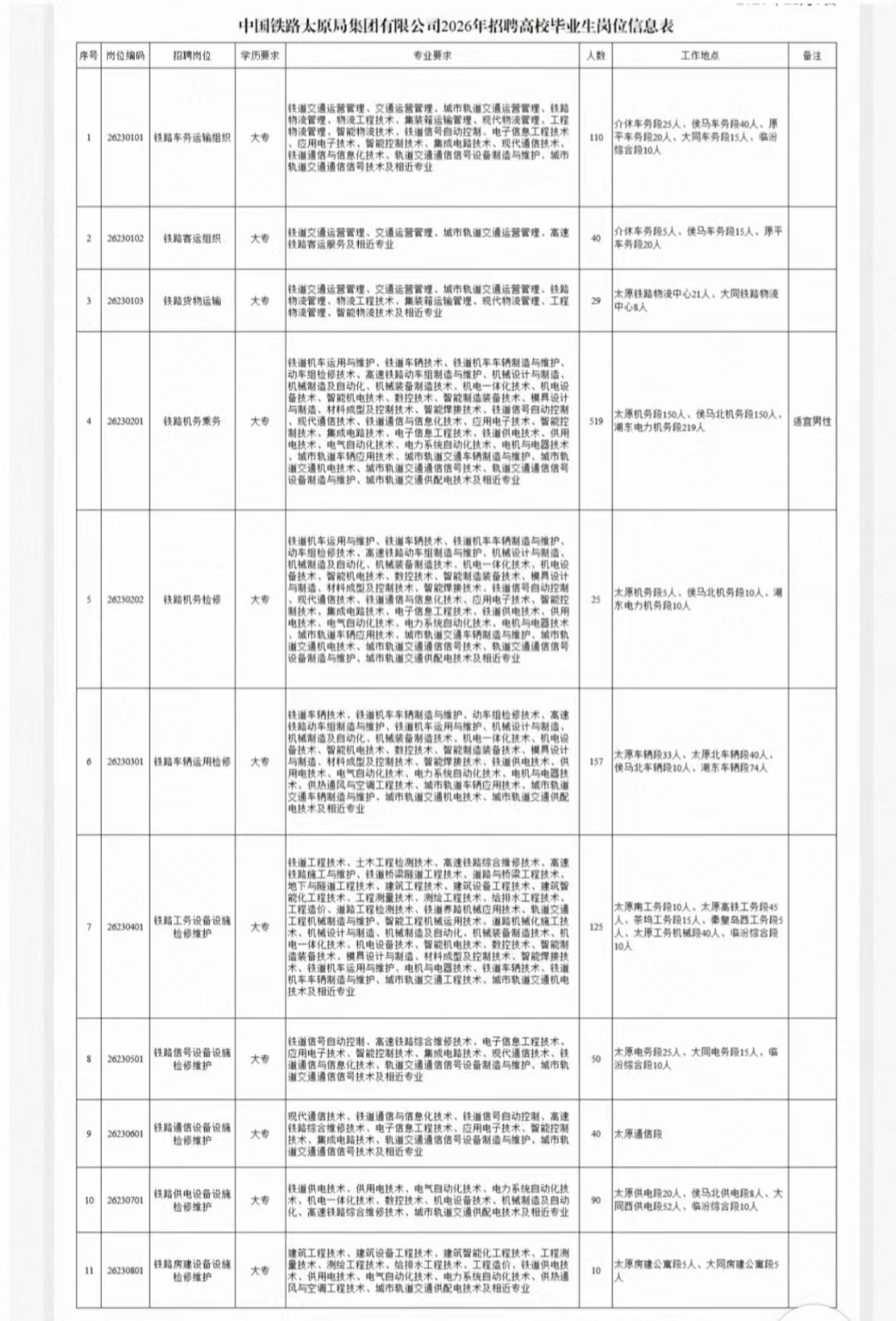 中国铁路太原局集团有限公司根据企业发展需要,现将2026年全日制普通高等职业院校高职(大专)毕业生招聘有关事项公告如下: