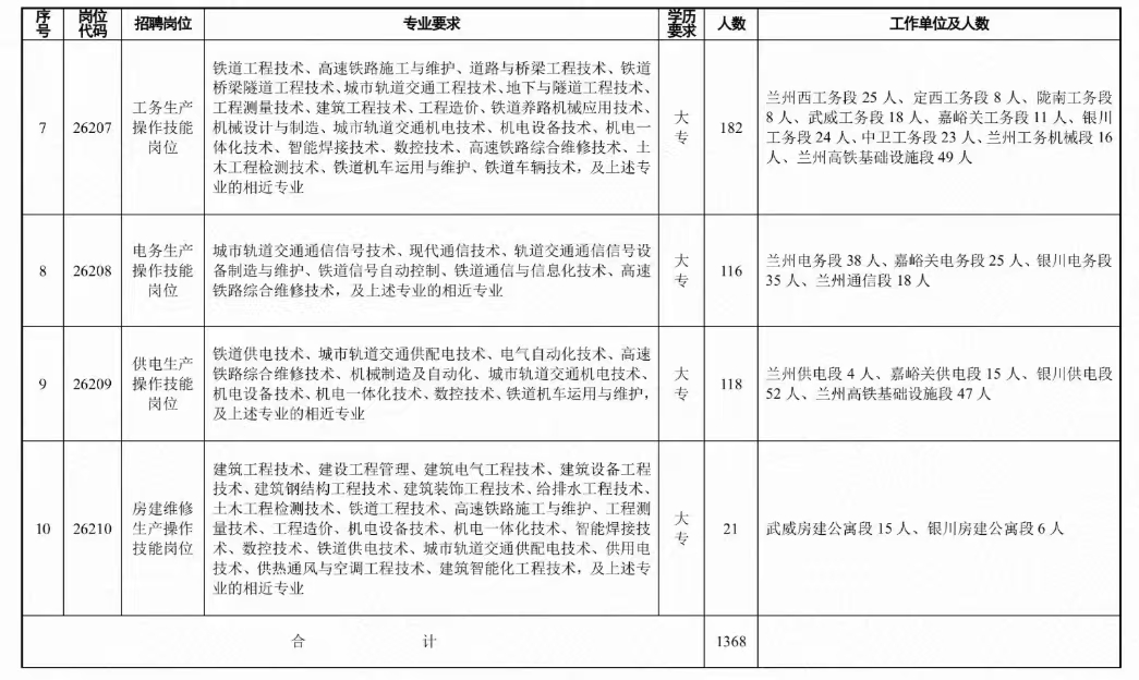 本次计划招聘1368人,招聘岗位均为铁路运输生产一线操作技能岗位,具体岗位、专业、工作单位及招聘人数详见附件。