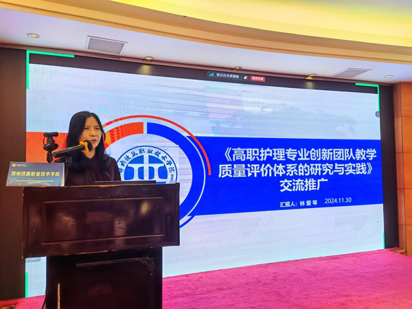 林爱琴全面介绍了该研究的背景、研究思路、方法和实施过程,并深入阐述了高职护理专业教学质量评价的创新模式,特别是如何通过构建科学的内部和外部评价体系,助力教师团队发展与教学质量的持续提升。研究成果得到了与会专家的高度认可和一致好评。