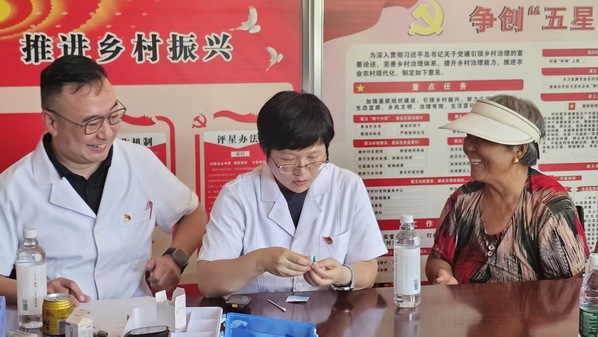 在血压和血糖测量区域,党员们有条不紊地为村民们进行检测。每测量完一位村民,他们都会仔细记录数据,并根据测量结果为村民们分析健康状况。对于血压或血糖偏高的村民,老师们会进一步了解他们的生活习惯,提醒他们注意饮食清淡、适当运动,并建议定期复查。活动期间,还为村民进行了中医拔罐服务,同时还向村民普及中医养生知识,讲解拔罐的原理与功效,让传统中医文化在乡村“生根发芽”。