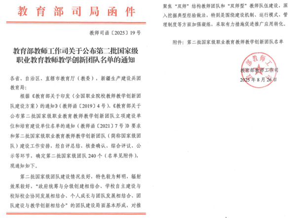 8月26日,教育部教师工作司公布《第二批国家级职业教育教师教学创新团队名单》(教师司函〔2025〕19号),经过三年扎实建设,经专家评审、公示等环节,通过教育部验收,被正式确认为第二批国家级职业教育教师教学创新团队。