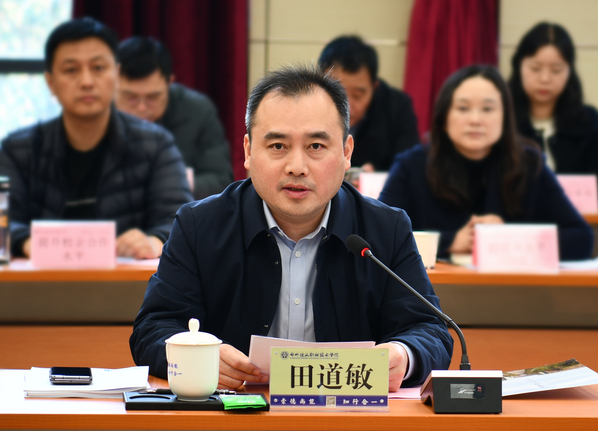 田道敏致欢迎辞,他对专家组莅临学校指导工作表示最诚挚的感谢与最热烈的欢迎。五年来,全校上下对标“双高”建设目标任务,统筹谋划,精准施策,全力推进,认真完成各项建设任务,取得了一系列国家级和省级标志性成果。学校将以此次“双高”现场考察为契机,不断改进工作、推动发展,在助力国家高铁事业发展、推进中国式现代化河南实践中书写好郑州铁院高质量发展新篇章。
