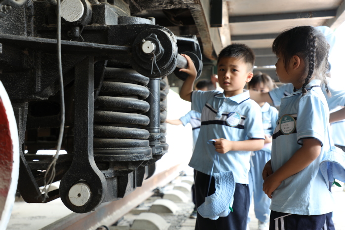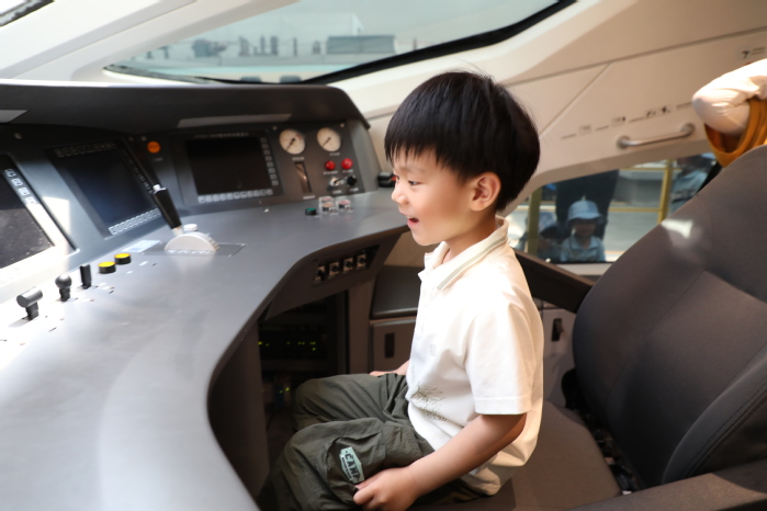 活动现场,机车车辆学院志愿者带领幼儿园的小朋友们参观铁龙广场、铁路文化博物馆和车辆综合演练场,观摩不同时代的机车。 从笨重庞大的蒸汽机车,到高效环保的内燃机车,再到如今智能化、数字化的“复兴号”高铁,孩子们在机车的演变中触摸中国铁路的发展脉络。在活动展区,小朋友们近距离观察高铁的精密结构,走近转向架内部,亲眼看到空气弹簧、抗蛇行减震器等黑科技装置如何协同工作,了解“复兴号”如何以每小时350公里的速度平稳运行。在体验展区,孩子们化身“动车组司机”,跟随志愿者的专业指导,亲手操控“复兴号”模拟驾驶台。从启动、加速到紧急制动,孩子们眼神专注,严格遵循标准化作业流程,亲手驾驭“复兴号”体验风驰电掣,于方寸驾驶舱中读懂中国速度。