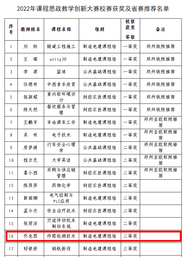 为全面推进课程思政建设,将思想政治工作贯穿教育教学全过程,不断提升高校教师课程思政教学水平和创新能力,我校组织开展了2022年课程思政教学创新大赛。经各教学单位推荐、文本材料审核与专家现场评审,评选出2022年课程思政教学创新大赛校级一等奖8个、二等奖8个和三等奖10个,其中我院教师乔龙图获二等奖。