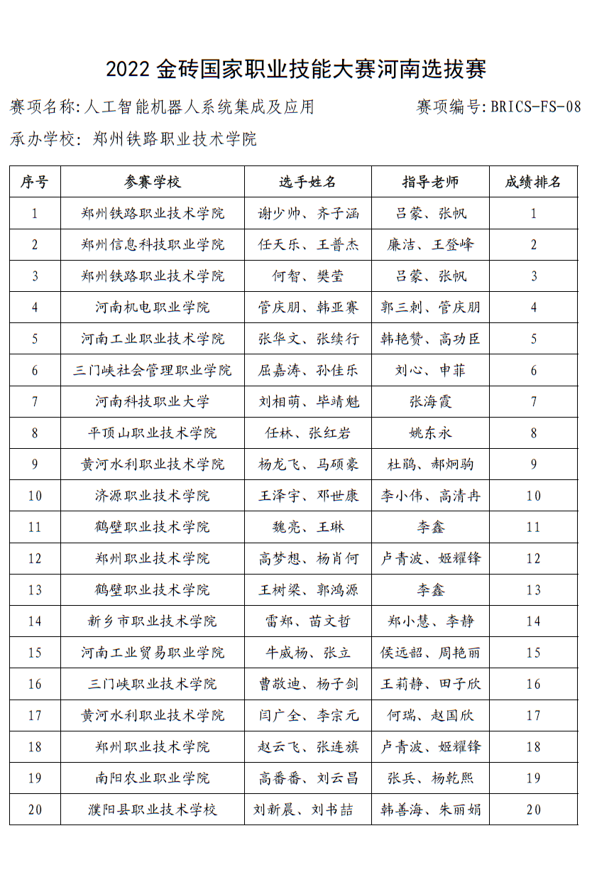 由河南省教育厅主办、beat365英国官方网站承办的2022年金砖国家职业技能大赛河南选拔赛“人工智能机器人系统集成及应用”赛项已于2022年10月6日圆满结束,赛项组委会依据赛项规程对各参赛队的竞赛情况进行了评判,现将赛项成绩公告如下: