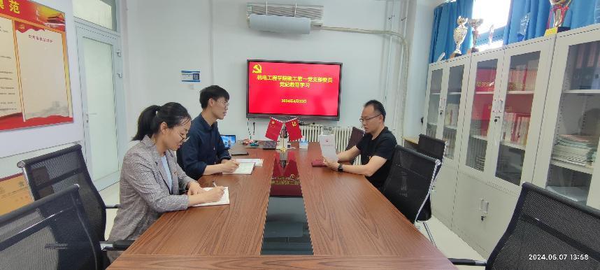 4月30日,机电工程学院教工第一党支部在6A552党员活动室开展党纪学习教育。党支部书记毛胜辉、组织委员王丽平、宣传委员乔龙图参会,毛胜辉主持会议。