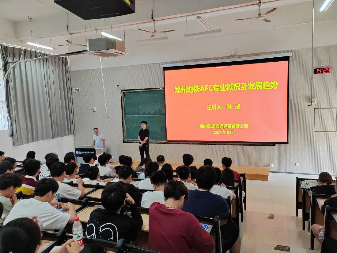 6月11日下午,机电工程学院在7125教室举行了以“郑州地铁AFC专业概况及发展趋势”为题的专业技术讲座,城市轨道交通机电技术专业300余名师生现场聆听了讲座。