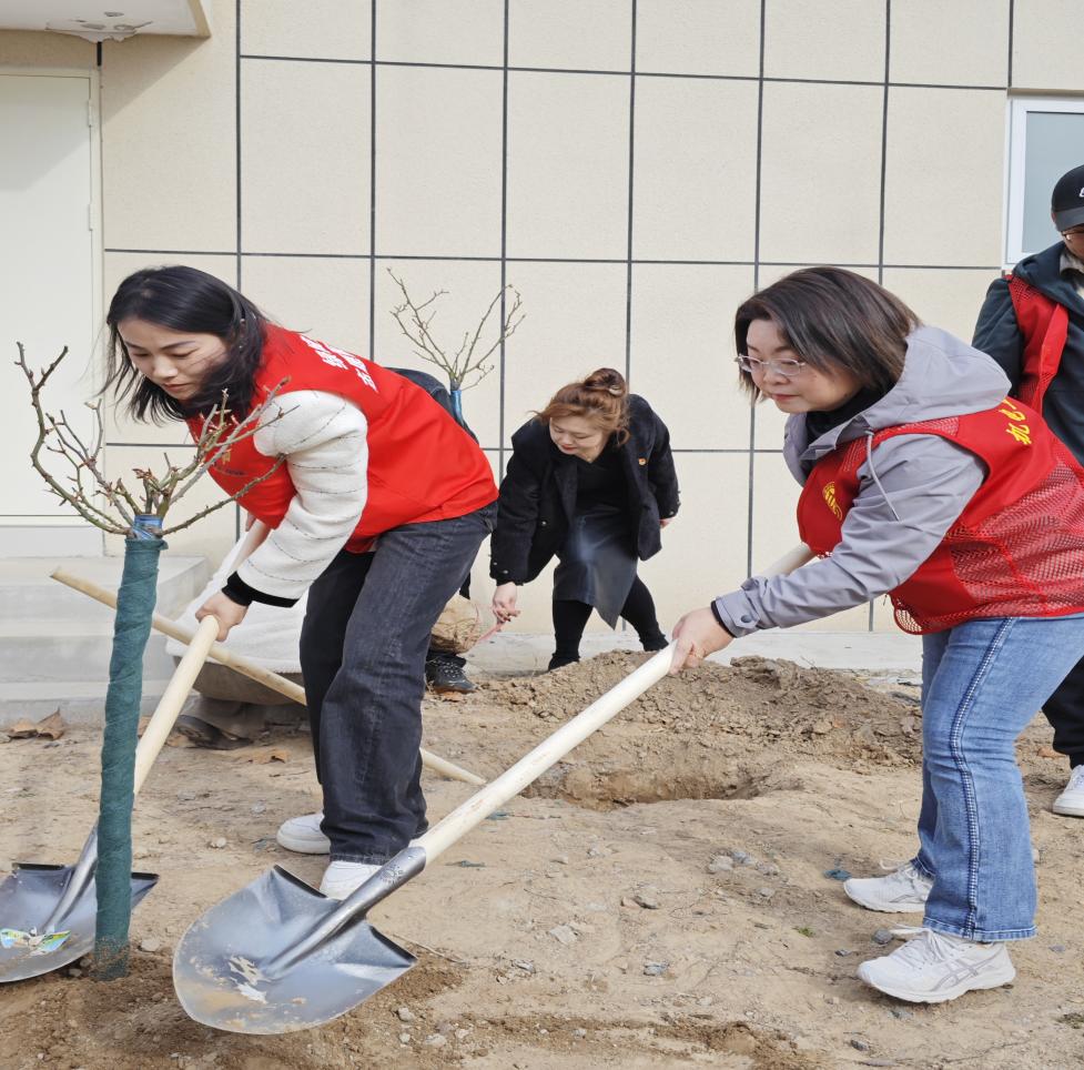 植树现场,女教师们热情高涨,分工有序。挥锹铲土、扶苗填坑、培土浇水……每一环节都凝聚着团队协作的默契。 经过一个多小时的奋战,15株月季树苗在学校东门绿化带中迎风挺立,与女教师们的笑颜交相辉映,绘就春日校园最美画卷。