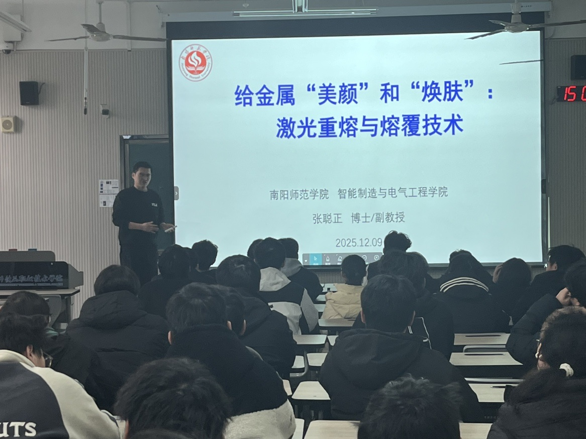 第二场讲座由南阳师范学院智能制造与电气工程学院张聪正博士、副教授主讲,主题为《给金属“美颜”和“焕肤”:激光重熔与熔覆技术》。张博士从激光的基本原理讲起,系统介绍了激光先进制造技术的发展历程与应用分类,重点阐述了激光重熔与激光熔覆技术的工艺特点、材料组织调控及在表面工程、零件修复等领域的应用前景。他通过大量显微组织图片、性能数据与工程实例,生动展示了激光技术如何提升材料的耐磨、耐腐蚀性能,并展望了激光制造在轨道交通装备修复与再制造中的潜在价值。讲座内容新颖、图文并茂,激发了师生对先进制造技术的浓厚兴趣。