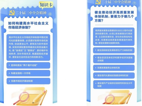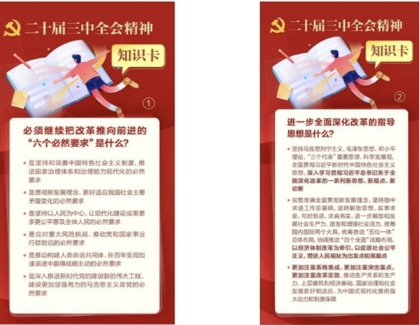 该活动以“强化学习、分享知识”为主旨,定期通过创新的知识卡图片形式将全会精神重要内容发至机关党务群、支部书记群,既方便党员干部利用碎片化时间学习理论知识,又能检验知识掌握的牢固度,营造常学常新、善思善悟的学习氛围,引导党员干部切实把思想和行动统一到二十届三中全会精神上来。