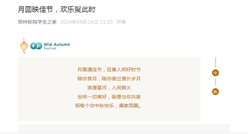 通过钉钉、郑州铁院学生之家微信公众平台等对中秋节的由来、传统习俗、浪漫神话和经典故事进行广泛宣传,传播文明新风,让师生深入了解中华优秀传统文化的魅力,增强文化自信和民族自豪感,营造浓厚的节日氛围。