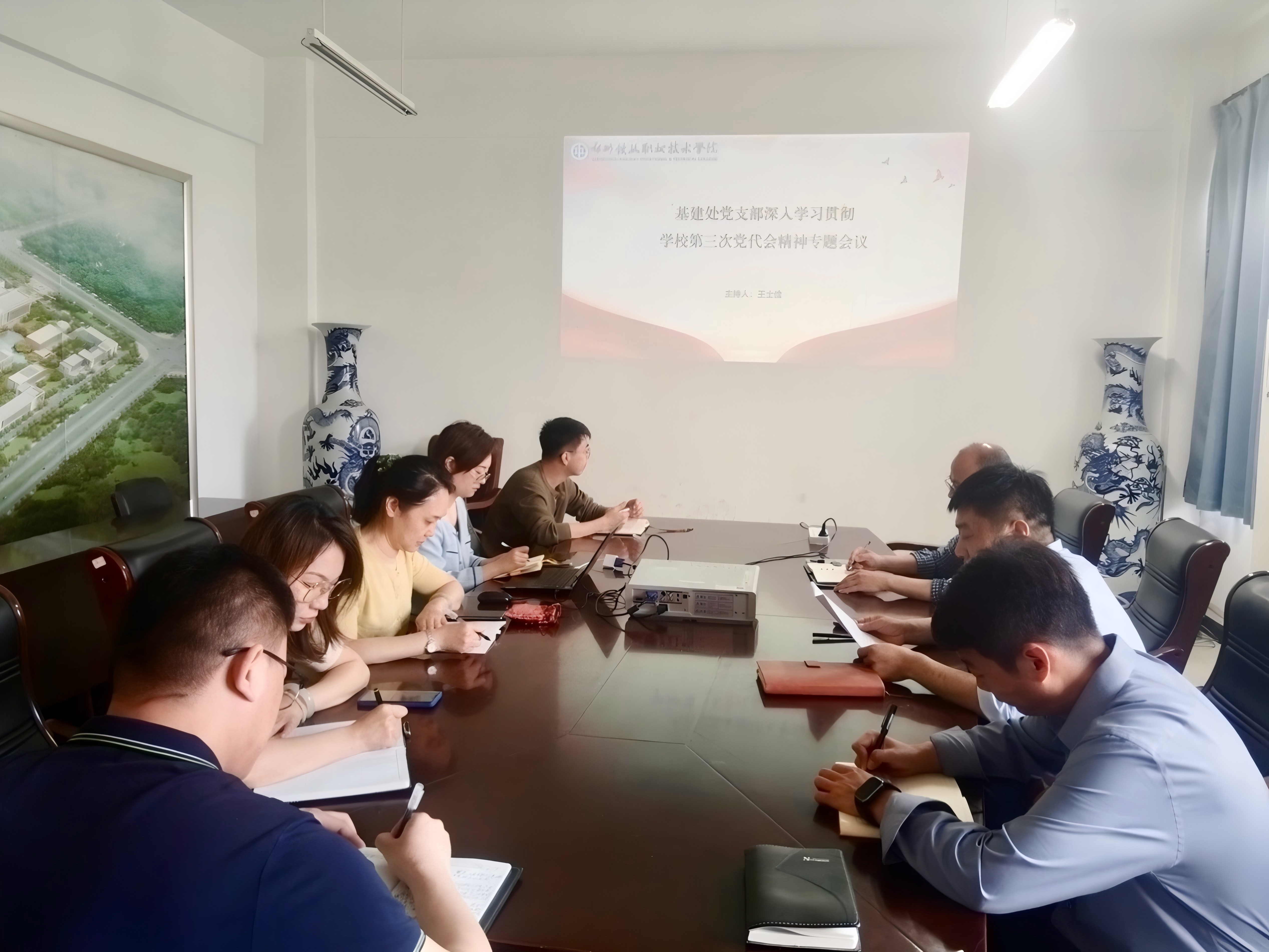 近日,基建处在办公楼406会议室召开学习贯彻学校第三次党代会精神专题会议。会议由党支部书记王士俭主持,处室全体人员参会。