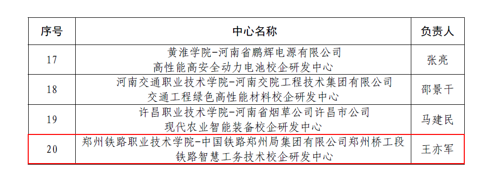 本次认定的河南省校企研发中心(重点)共20个,其中高职院校3所;认定河南省校企研发中心25个,其中高职院校7个。王亦军教授负责的“铁路智慧工务技术研发中心”充分发挥铁道工程学院专业优势,联合郑州局郑州桥工段,聚焦铁道基础设施安全防护领域“疑难急险”的病害和灾害,围绕铁路基础设施智能监测与诊断、铁道基础设施安全防护技术、铁路运维安全与应急响应三个领域开展研究。