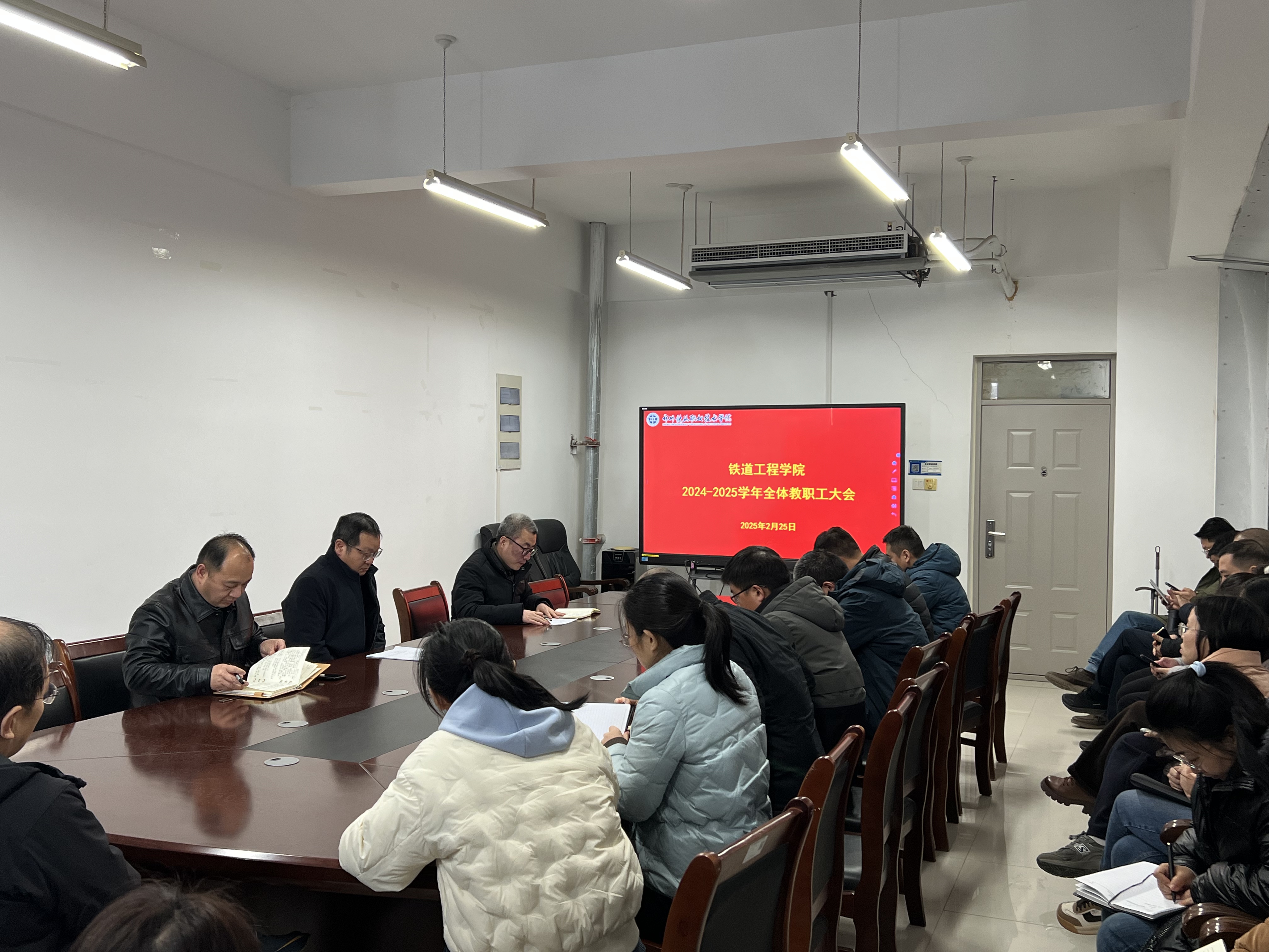 2025年2月25日,铁道工程学院在学院会议室召开全体教职工大会。此次大会总结了2024年的工作,明确了2025年的工作方向和目标,进一步凝聚人心、激发活力,推动学院各项事业持续健康发展。学院党总支书记郭运宏、院长王亦军、副院长陈彦恒及全体教职工参加了此次会议。