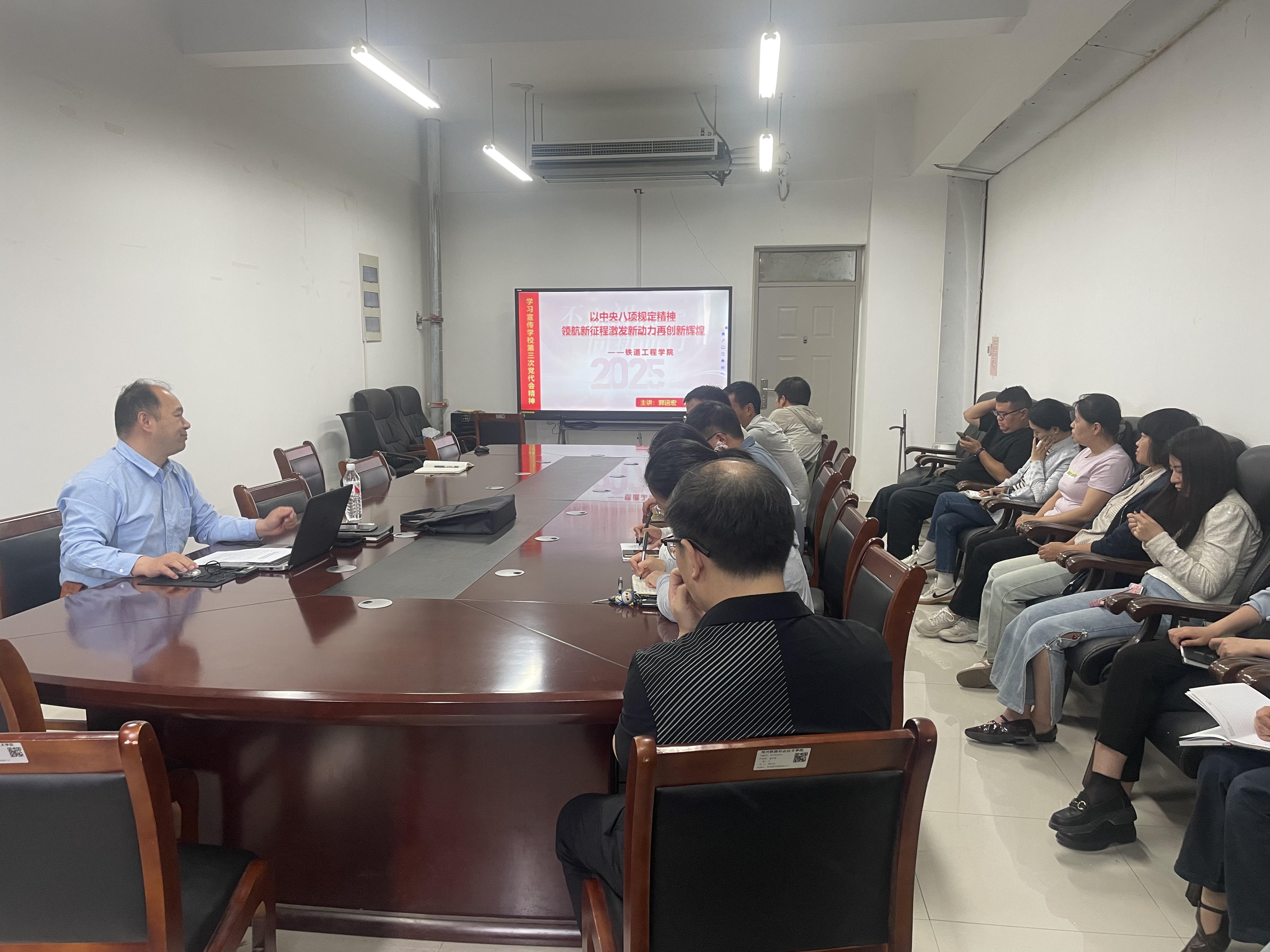 2025 年 4 月 29 日,铁道工程学院党总支书记郭运宏为学院全体党员带来了一场意义深远的党课,党课围绕落实学校第三次党代会精神,并以中央八项规定精神领航新征程激发新动力再创新辉煌为题,引导党员思考如何在工作中贯彻落实,推动学院事业高质量发展。