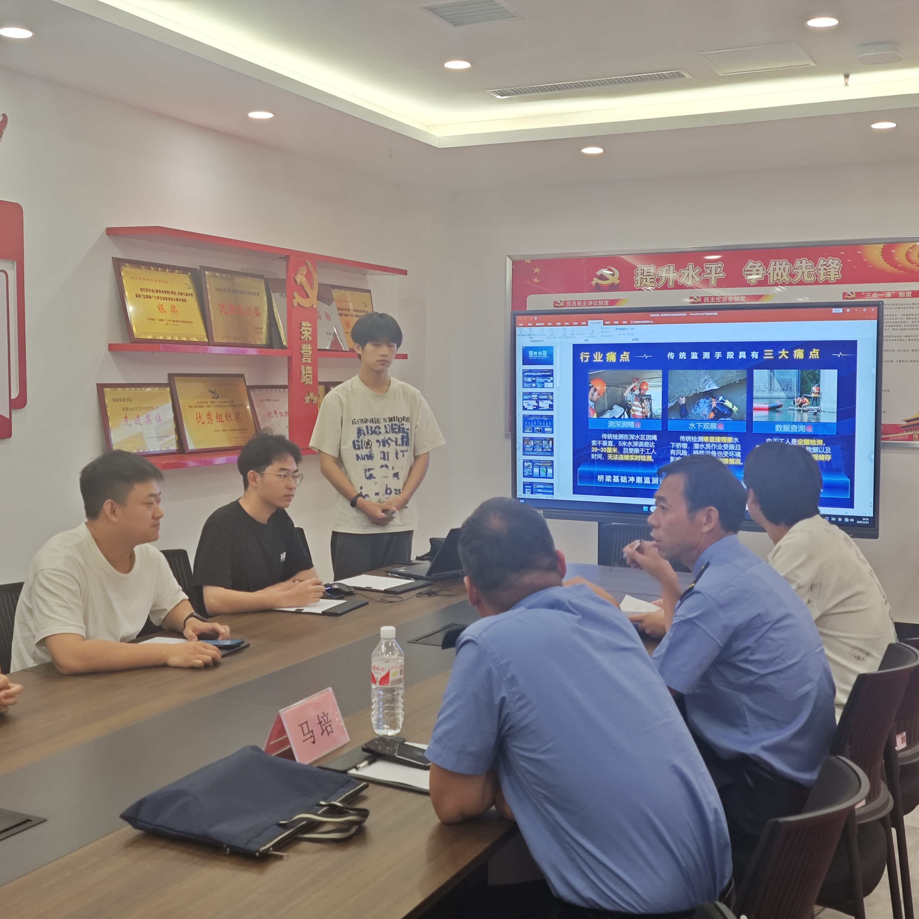 第二队学生聚焦桥梁养护难题,汇报了“桥检‘先锋’——桥梁病害智能巡检设备”,该项目利用AI图片识别分析与可视化报表等生成技术,有效提升了检测效率与精度。团队通过两个实际应用案例,验证了设备的实用价值。马培大师点评了AI算法的创新性,同时建议进一步优化结构设计,以适用于更广泛性的材料。此外,他还就行业现状与竞品对比提出了建设性意见,鼓励团队深化技术细节研究。