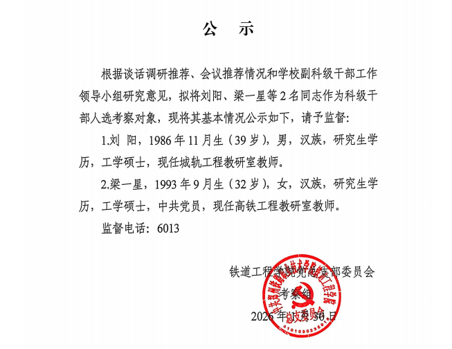 铁道工程学院副科级干部公示文件