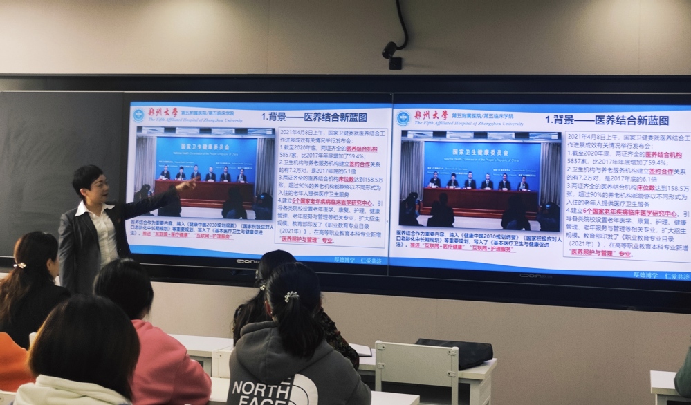 汪桂琴主任以《智慧医养结合探索》为题,从我国老龄化形式的严峻性、“9073”的养老格局、医养结合时代背景引入,对郑州大学第五附属医院医养结合的实践做法以及实施效果进行了深入浅出的诠释,同时对智慧医养结合进行了展望。讲座紧密结合当前实际,生动、形象,课堂气氛活跃,反响热烈,赢得阵阵掌声。