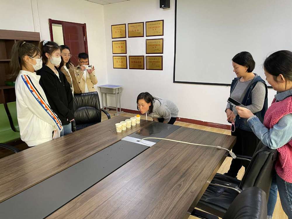 随后大家又转移到会议室进行另一项趣味赛——吹球入杯。