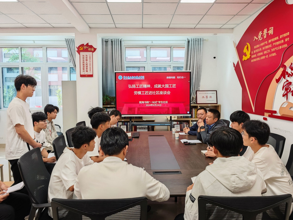 为落实陇海书院“一站式”学生社区党建特色品牌“赓续百年陇海精神”育人工作需求,弘扬工匠精神,成就大国工匠,增强学生铁路专业岗位认知。9月24日,陇海书院特邀“全国五一劳动奖章”获得者蒋涛在陇海书院党团活动室召开“劳模工匠进社区”座谈会,各专业学生代表参加学习交流。