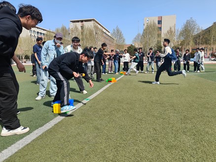 作为压轴项目,“欢乐绑腿跑”将活动推向高潮。各组队员双腿绑缚,齐声喊着“一二一”口号冲向终点。过程中,有的队伍因节奏混乱摔倒,但迅速调整状态重新出发,该项目生动诠释了“团队协作无短板”的理念,让学生干部们深刻体会到“目标一致、同频共振”的重要性。
