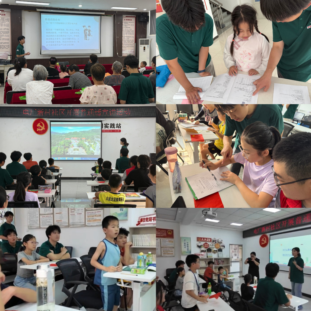 在郑州上街区峡窝镇金昌社区与洛阳电厂新村社区,团队聚焦老年群体与儿童两大重点对象,通过多样化形式层层推进推普工作。借助PPT演示,用菜市场砍价、医院问诊等贴近生活的案例,生动拆解推广普通话的社会价值,让抽象意义变得直观可感;开展社区普通话专项调研,精准描摹不同群体的语言使用现状与学习需求;设计绕口令挑战、汉字拼音猜谜等趣味小游戏,以互动形式降低学习门槛—孩子们在欢笑中踊跃参与,老年人也在轻松氛围中重拾学习兴趣,推动普通话融入社区日常生活场景。