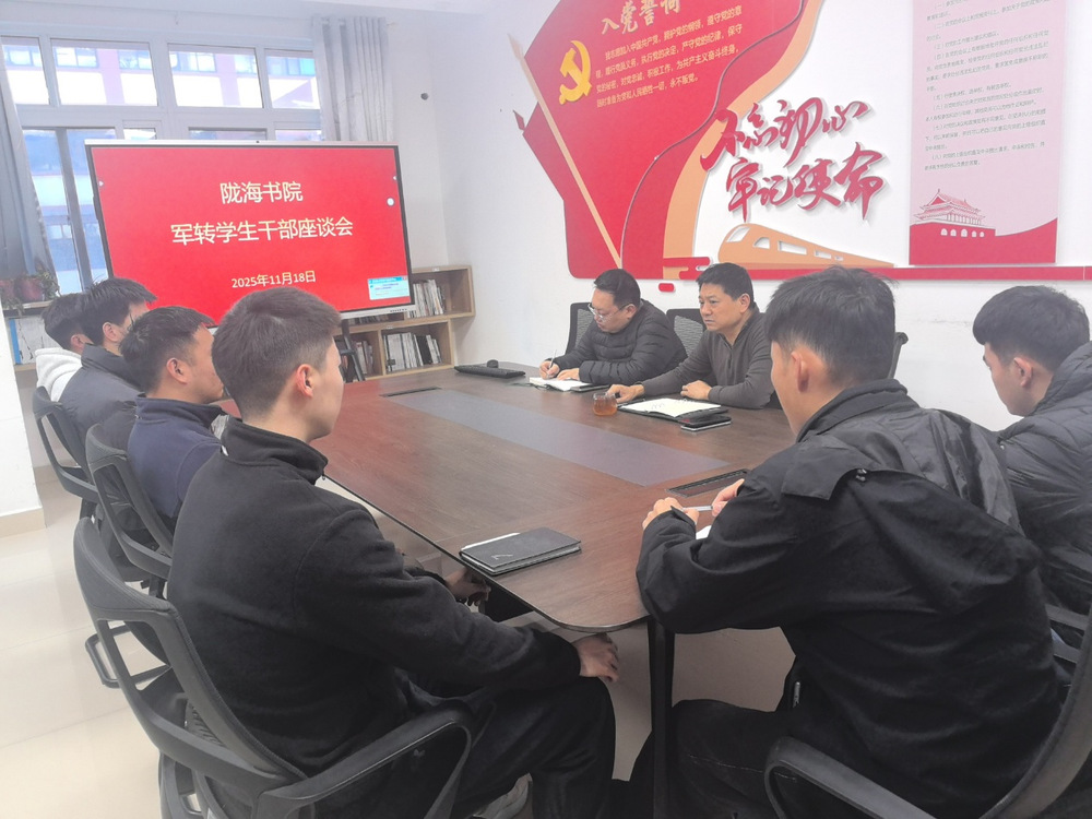 为进一步强化陇海书院军转学生干部队伍建设,11月18日,陇海书院专题召开军转学生干部座谈会。书院党总支书记、院长刘斌,党总支副书记李锐出席会议,全体军转学生干部参加座谈。