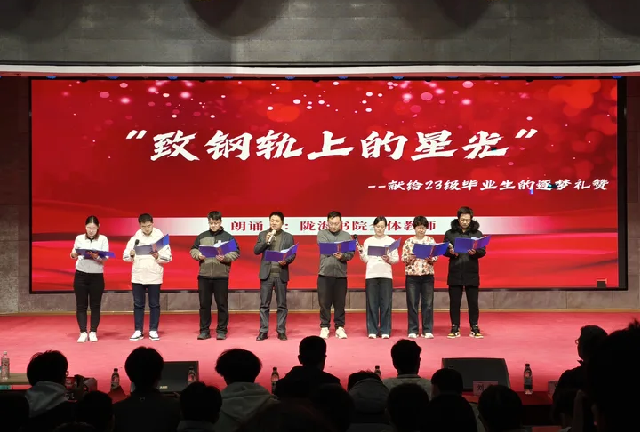 晚会在《平凡之路》的悠扬旋律中拉开序幕。由陇海书院全体育人导师带来的《致钢轨上的星光》诗朗诵,以饱含深情的语言,回望学子们在书院的成长岁月,寄语大家带着“铁路人”的责任与担当,用青春力量书写铁路事业发展的崭新篇章。