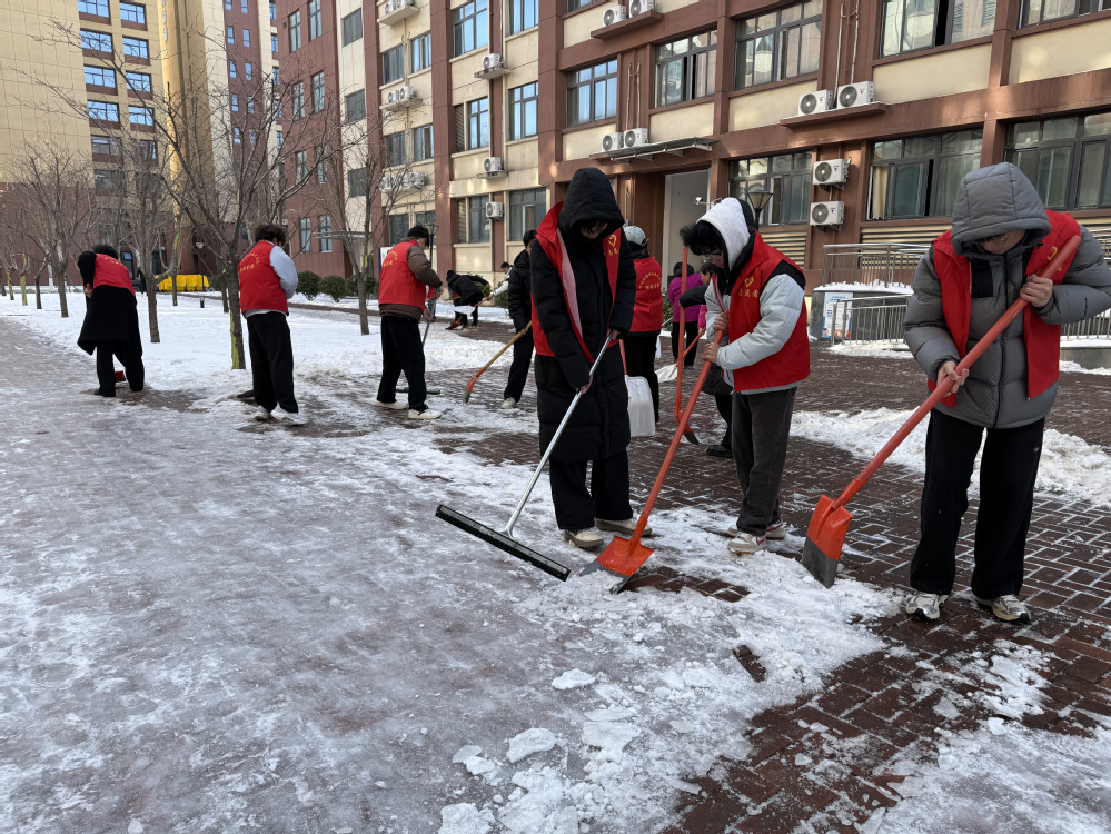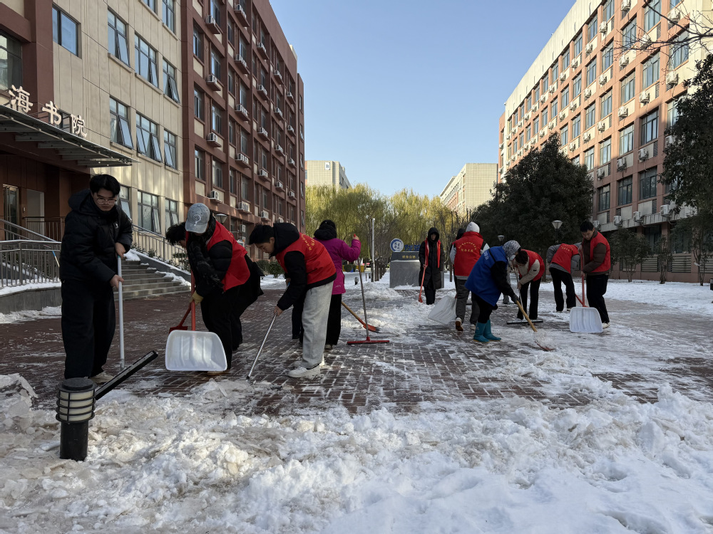 活动现场,大家迅速明确分工、默契协作,以宿舍楼出入口、楼道台阶、宿舍区主干道为核心清理区域,手持雪铲、铁锹、扫帚等工具投入战斗。尽管寒风凛冽,但每个人干劲十足、热情高涨,忙碌的身影构成了校园里一道温暖的风景线。经过数小时的不懈努力,宿舍区周边原本被冰雪覆盖的路面、台阶被彻底清理干净,为师生们开辟出一条安全通畅的“暖心通道”。