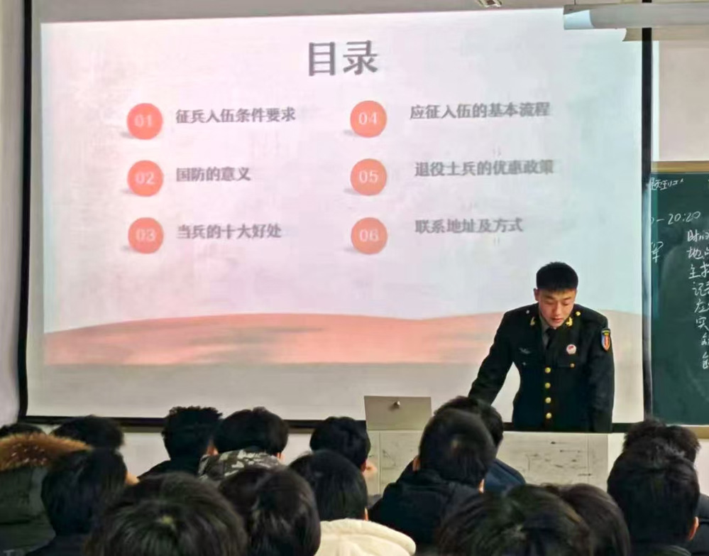 为落实2025年征兵工作,激发学生参军热情,陇海书院于12月14日组织全体24级、25级学生开展“参军尽义务,戍边卫国防”退伍兵进班级征兵宣传活动