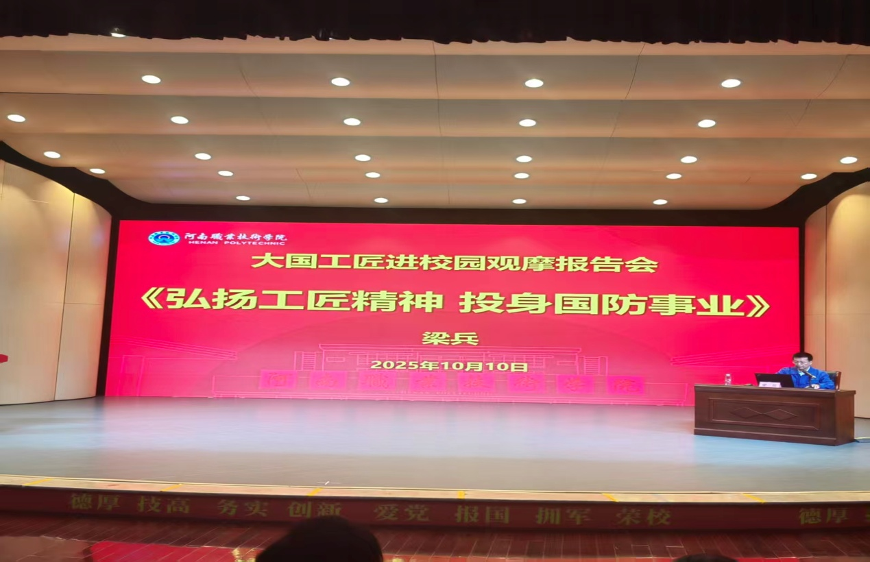 10日下午,在河南职业技术学院学术报告厅举行了“大国工匠进校园观摩活动”,邀请了河南平原光电有限公司数控操作高级技师,正高级工程师,中国兵器工业集团公司首席技师,党的二十大代表,全国劳模,国务院政府特殊津贴获得者,国家级技能大师工作室领军人,河南省 12 名大国工匠之一梁兵同志现为大家作了《弘扬工匠精神,投身国防事业》的报告,与会代表和河南职业技术学院师生代表聆听了报告会。