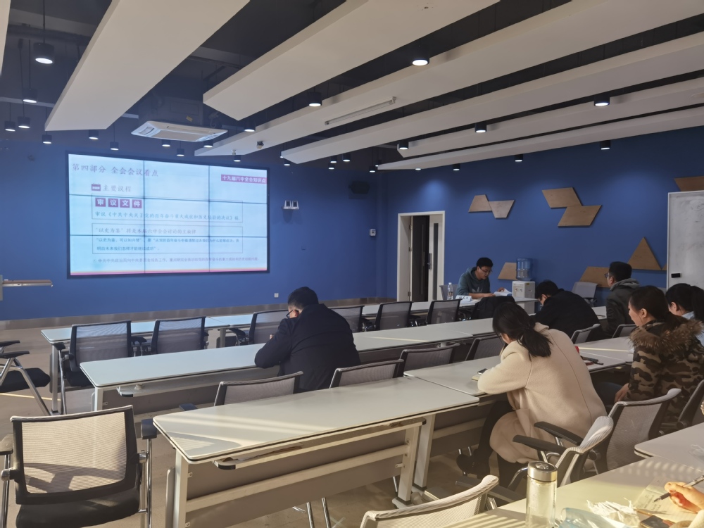 2021年12月21日,丝路书院(国际教育学院)在7号楼215智慧教室集体学习党的十九届六中全会精神,此次学习由党总支副书记任冉领学,党总支全体教工参加。