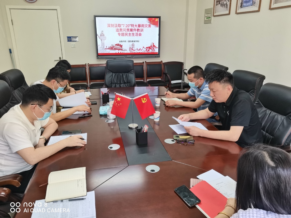 5月30日,丝路书院党总支为深刻汲取“7·20”特大暴雨灾害追责问责案件教训,根据《中共河南省纪委机关、中共河南省委组织部关于深刻汲取“7·20”特大暴雨灾害追责问责案件教训开展以案促改专题民主生活会的通知》精神,以及《中共河南省委教育工委办公室、河南省教育厅办公室关于深刻汲取“7·20”特大暴雨灾害追责问责案件教训开展以案促改专题民主生活会的通知》精神,围绕调查组《河南郑州“7·20”特大暴雨灾害调查报告》,聚焦民主生活会主题,在7205教室召开总支委员会专题民主生活会。学校纪委副书记王晓磊同志到会指导。