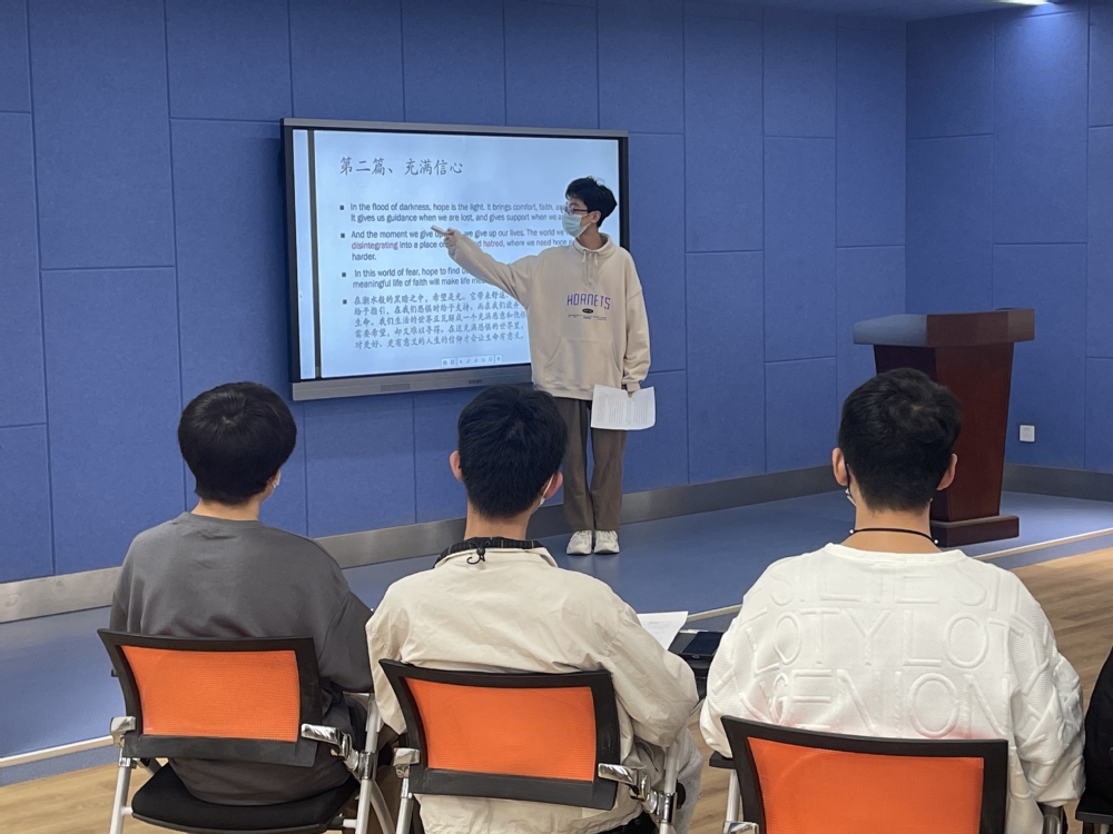 本期活动的主题为英文短文分享。来自高铁乘务22A3班的李梓翔同学英语功底深厚,他分别从“鉴别友情”“充满信心”“人生道理”和“等待给予”等方面向大家分享了四篇英文励志短文,并提炼主题词、强调重点句,让大家对词汇和文章都有了更深的了解。随后,英语沙龙现场开始了形式新颖多样的小环节,包括现场主题讨论、小组汇报、通过小游戏选人进行朗读练习等。师生在口语交流中一起享受着英语带来的乐趣,也将此次英语沙龙推向了高潮!